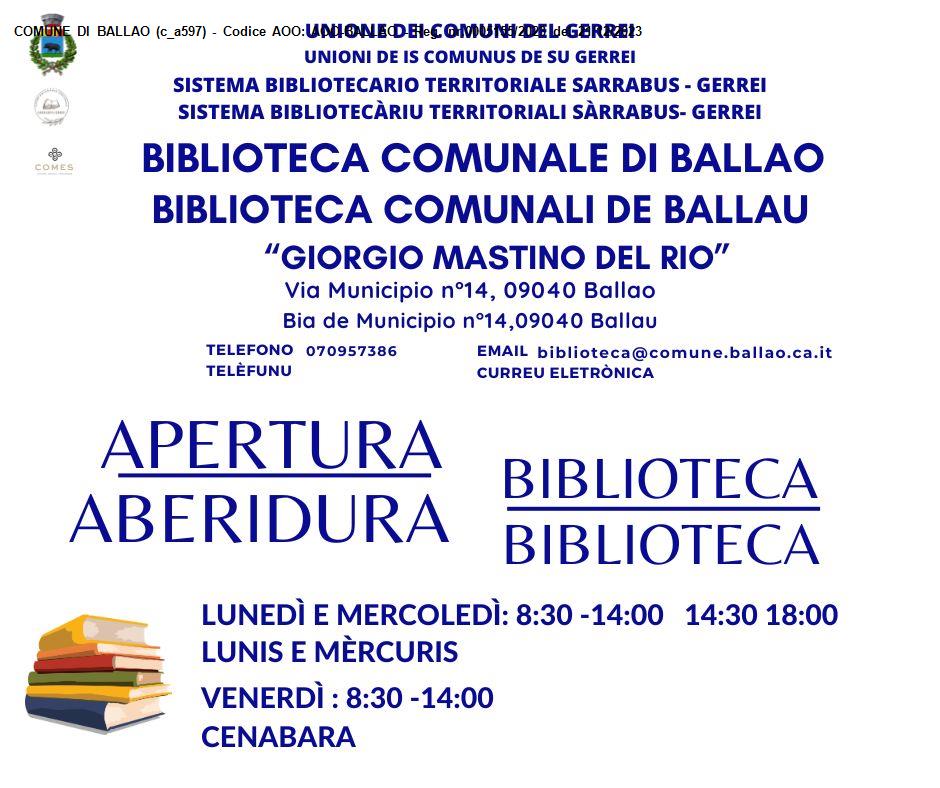 Biblioteca comunale G. Mastino del rio dal 15 dicembre 2023 riapre tre giorni settimanali